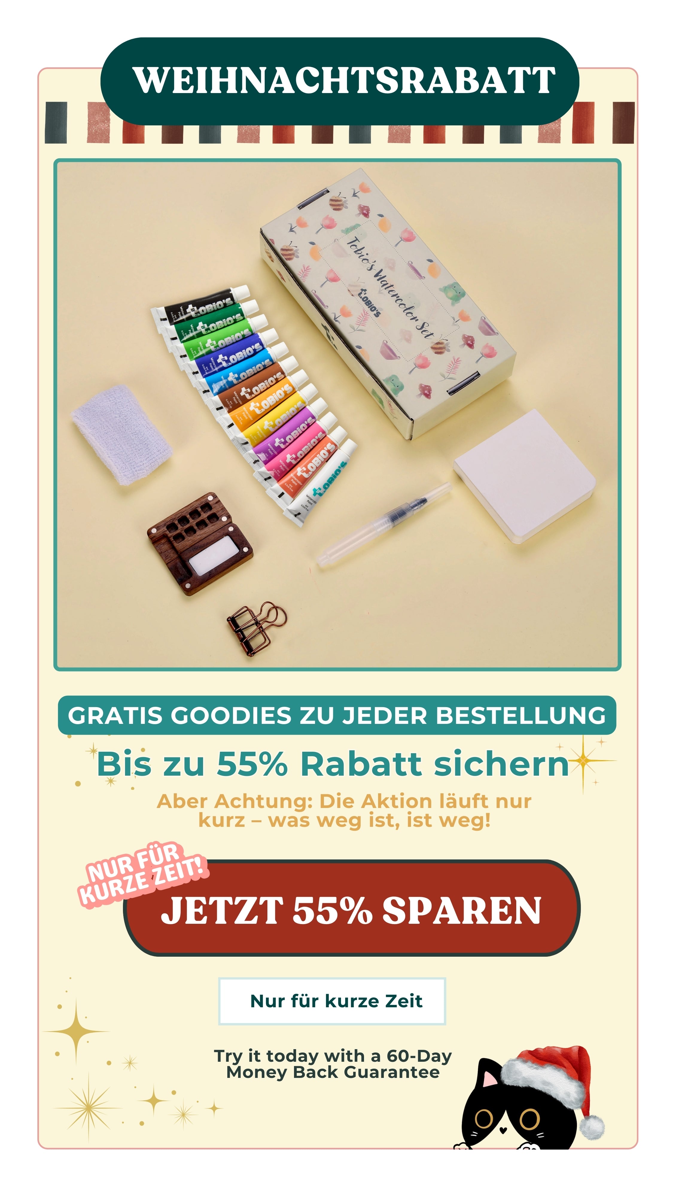 Ich bin Mel, Gründerin von Tobio’s, und ich habe dieses kleine, reisetaugliche Aquarell-Set entwickelt, um wieder Ruhe, Kreativität und Freude in mein Leben zu bringen – gerade dann, als alles laut, digital und überwältigend erschien. Ich glaube lange, dass nur ich diese Momente erleben würde – doch mittlerweile weiß ich, dass tausenden Menschen, wie auch du, diese Momente erlebst!