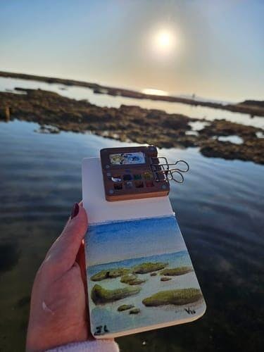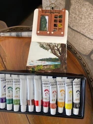 Setti on hyvin mietitty. Värejä on tarpeeksi, vesivärit ovat todella miellyttäviä käyttää. Suosittelen tilaamaan ylimääräisiä siveltimiä eri kokoisina heti. Myös laukku. Se mahtuu käsilaukkuun tai pieneen reppuun. Minipaletti voidaan helposti kiinnittää minikirjaan, jossa on tukevat akvarellipaperit maalaamista varten. On hauskaa muuttaa se vähitellen kuvakirjaksi. Maalasin kannen ja lakansin sen mattalakalla, jotta se kestäisi laukun sisällä. En uskonut, että pitäisin näin pienille alueille maalaamisesta niin paljon!
